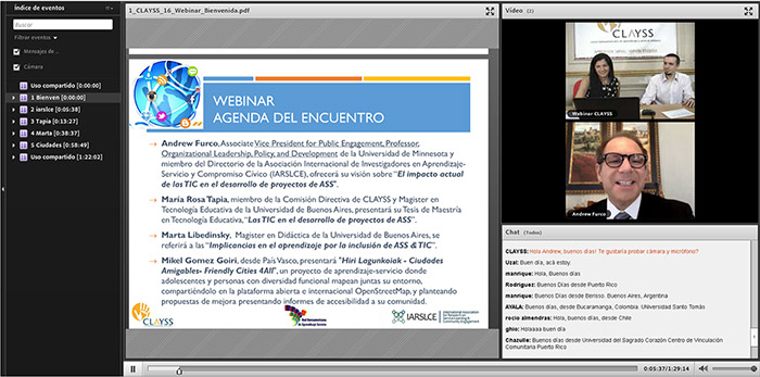 Organizado por CLAYSS con el apoyo de REDIBAS, en el marco del acuerdo con la Asociación Internacional de Investigadores en Aprendizaje-Servicio y Compromiso Cívico (IARSLCE), el viernes 11 de noviembre se llevó a cabo el Webinar “Las Tecnologías de la Información y de la Comunicación en el desarrollo de proyectos de Aprendizaje-Servicio Solidario”. Provenientes de más de 15 países de Iberoamérica, participaron del evento 37 investigadores, docentes y miembros de organizaciones interesados en el Aprendizaje y Servicio Solidario y en el uso educativo de las Tecnologías de la Información y de la Comunicación (TIC).