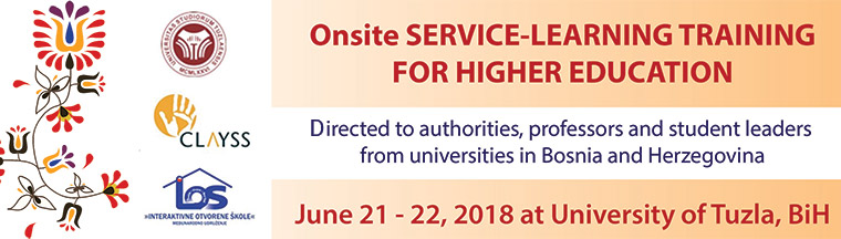Organized by the Centro Latinoamericano de Aprendizaje y Servicio Solidario (CLAYSS) and with the support of the Faculty of Natural Sciences and Mathematics of the University of Tuzla - PMF, and International Association "Interactive open schools" - MIOS the SERVICE-LEARNING TRAINING for HIGHER EDUCATION will take place on 21st and 22nd June, 2018 at the premises of the University of Tuzla.